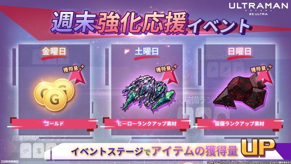 【1月29日週末限定!特別強化イベント!】ULTRAMAN BE ULTRA2021年1月28日読了時間: 1分週末の特別獲得量UPイベントを先週に引き続き3日間開催! 金曜日から日曜日まで、曜日によってランクアップ素材やゴールドの獲得量UP! 今週も、獲得量UPイベントで手持ちのキャラクターを強化しよう! ▼開催期間 1/29 00:00~1/31 23:59#BEULTRA#ULTRAMAN